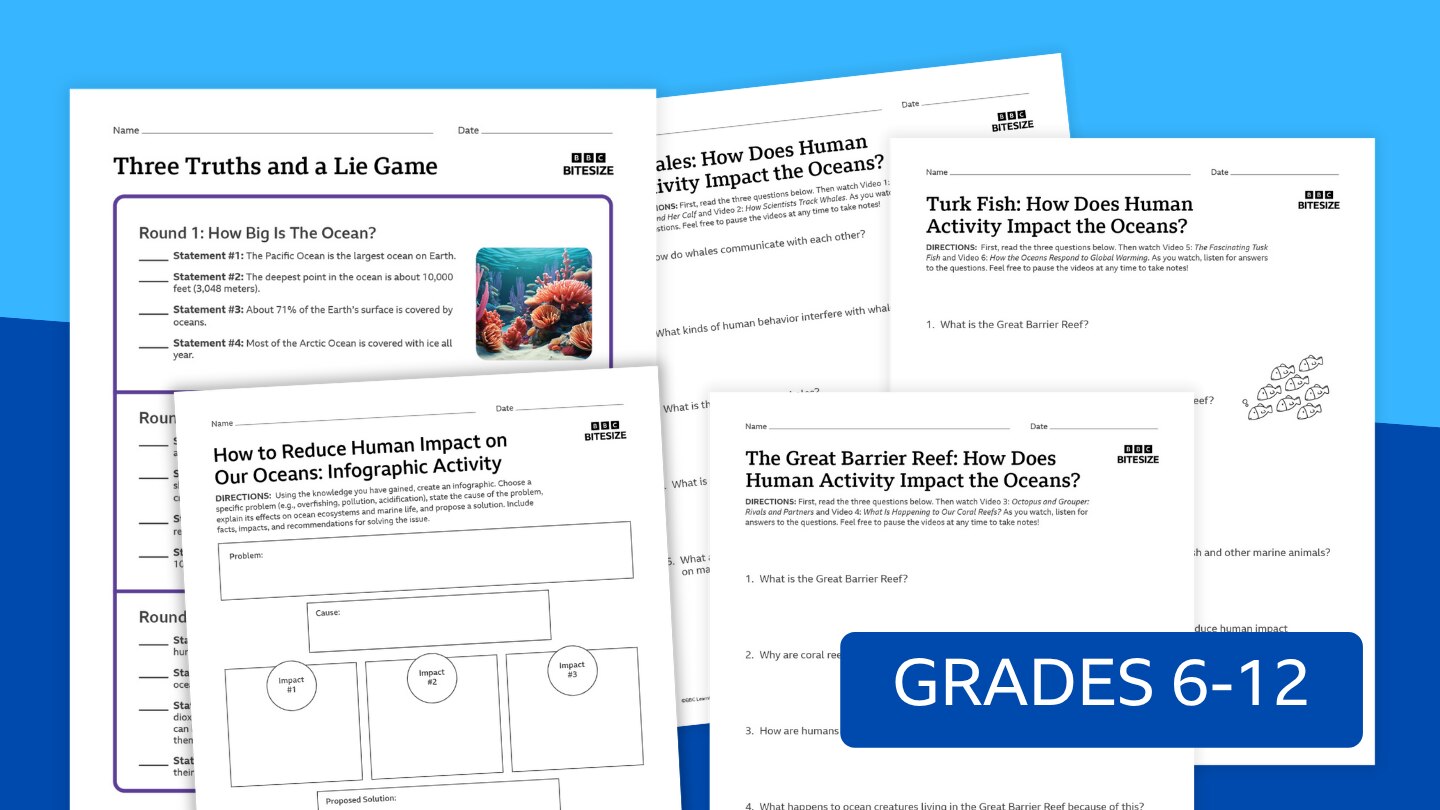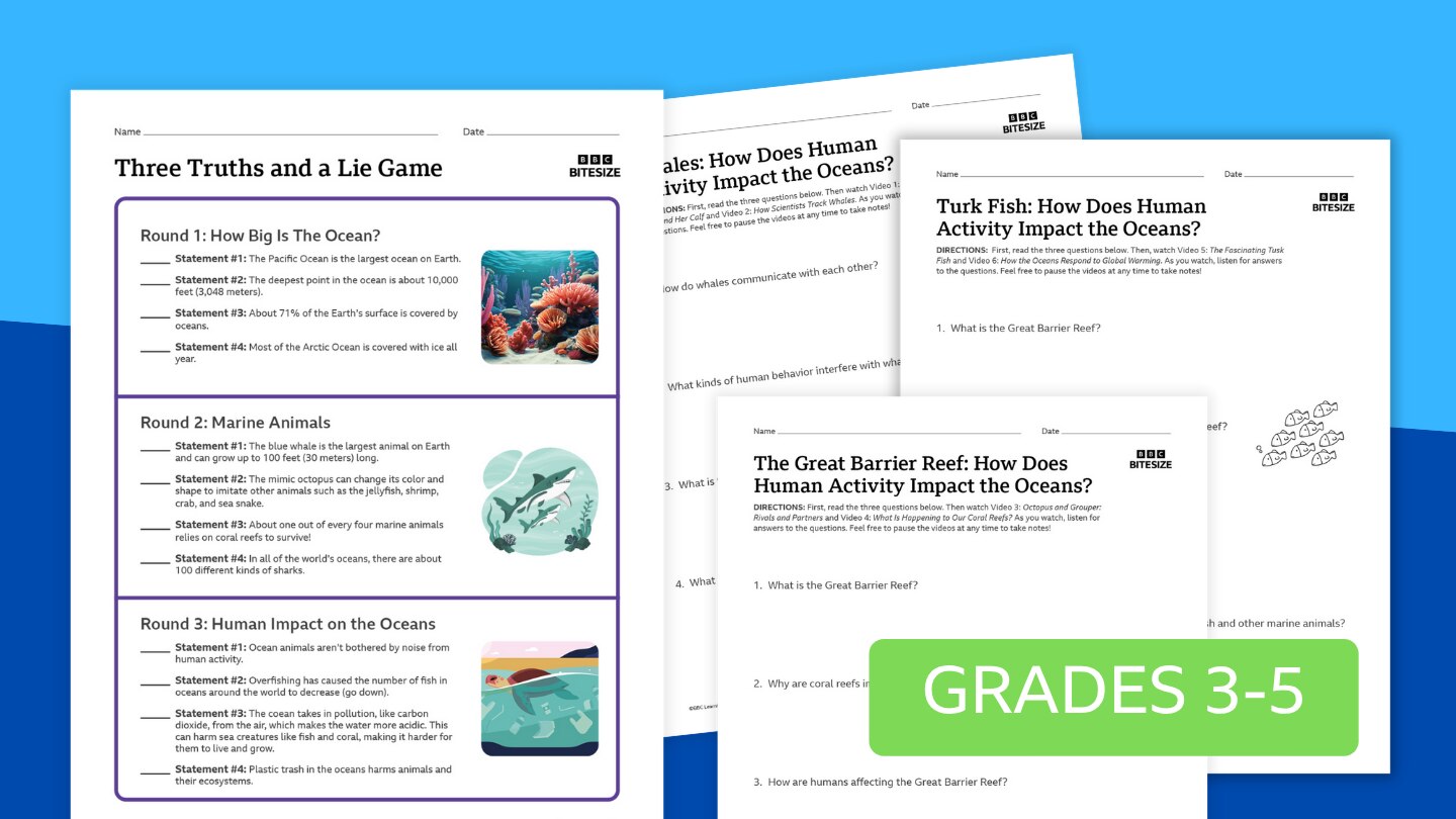 Play Three Truths and a Lie about oceans and answer questions about human impact on whales, tusk fish, and the Great Barrier Reef. Plus, complete an infographic activity on how to reduce human impact on our oceans.