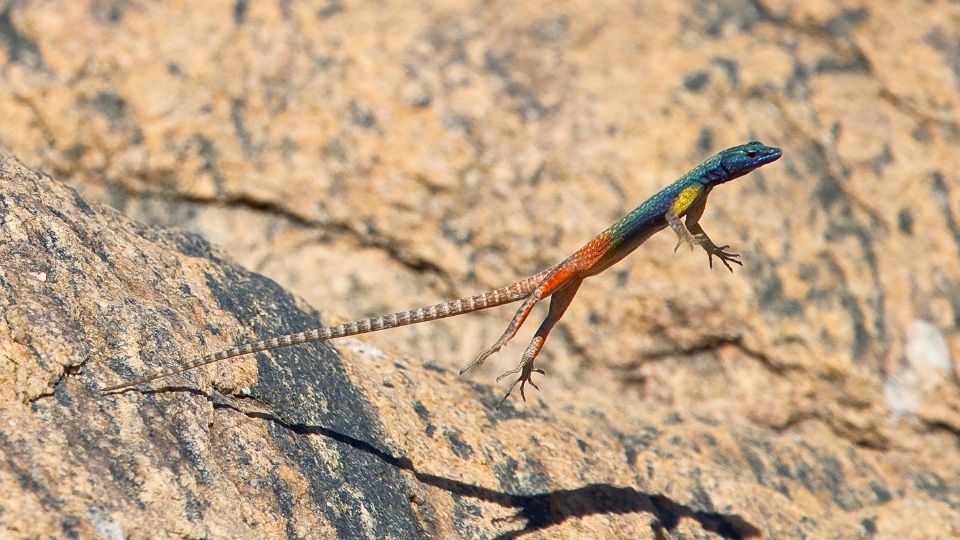 Introducing the incredibly acrobatic flat lizard! First watch Meet the Flat Lizard, a short clip from the award-winning BBC series Planet Earth. Sir David Attenborough takes you up close and personal with the multi-colored lizards who flaunt their bellies during territorial disputes. Watch as the lizards leap to eat a blackfly rising from the surface of water.