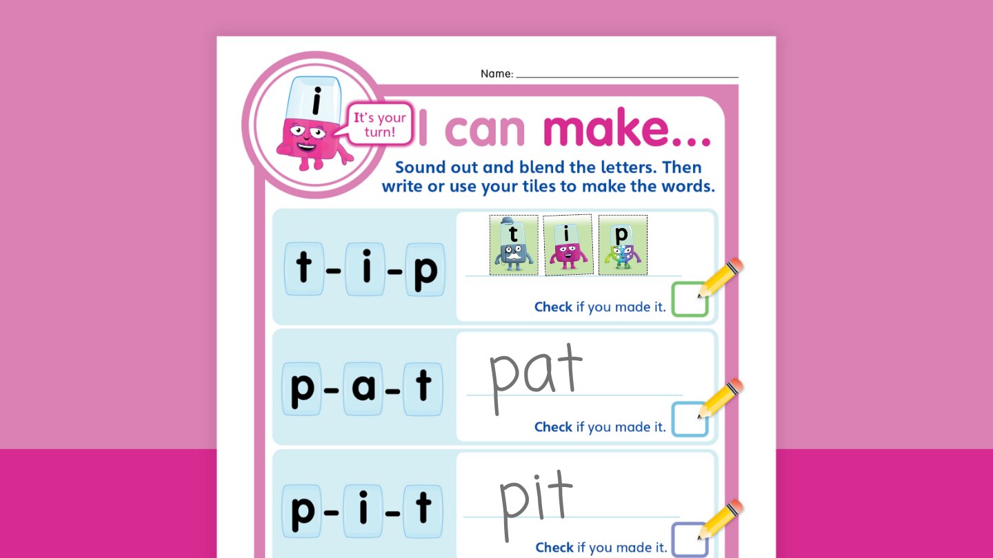 You’re a word builder! Sound out and blend the letters. Then write or use your tiles to make the words. Check if you made each of the consonant-vowel-consonant words: t-i-p, p-a-t, p-i-t, s-a-t.