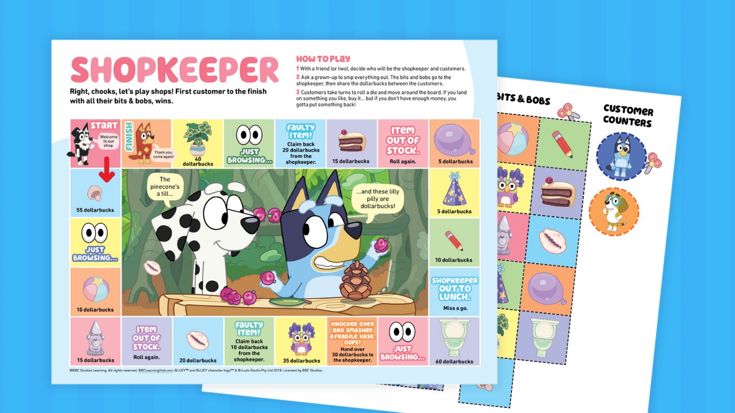 - Ask a grown-up to snip everything out. The bits and bobs go to the shopkeeper, then share the dollarbucks between the customers.