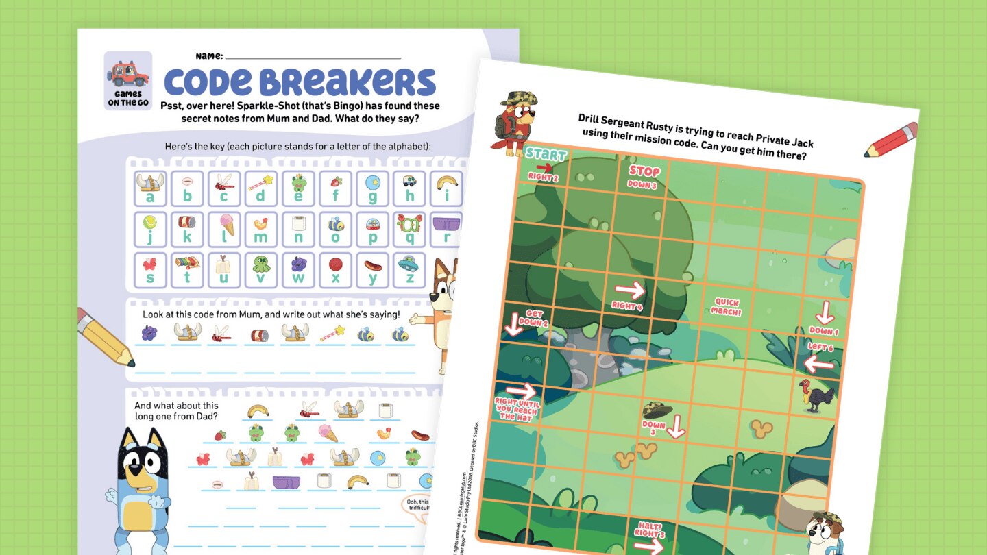 Psst, over here! Sparkle-Shot (that’s Bingo) has found these secret notes from Mum and Dad. What do they say? Look at the code from Mum and write out what she's saying! And what about a long message from Dad? Plus, help Drill Sergeant Rusty reach Private Jack using their mission code.