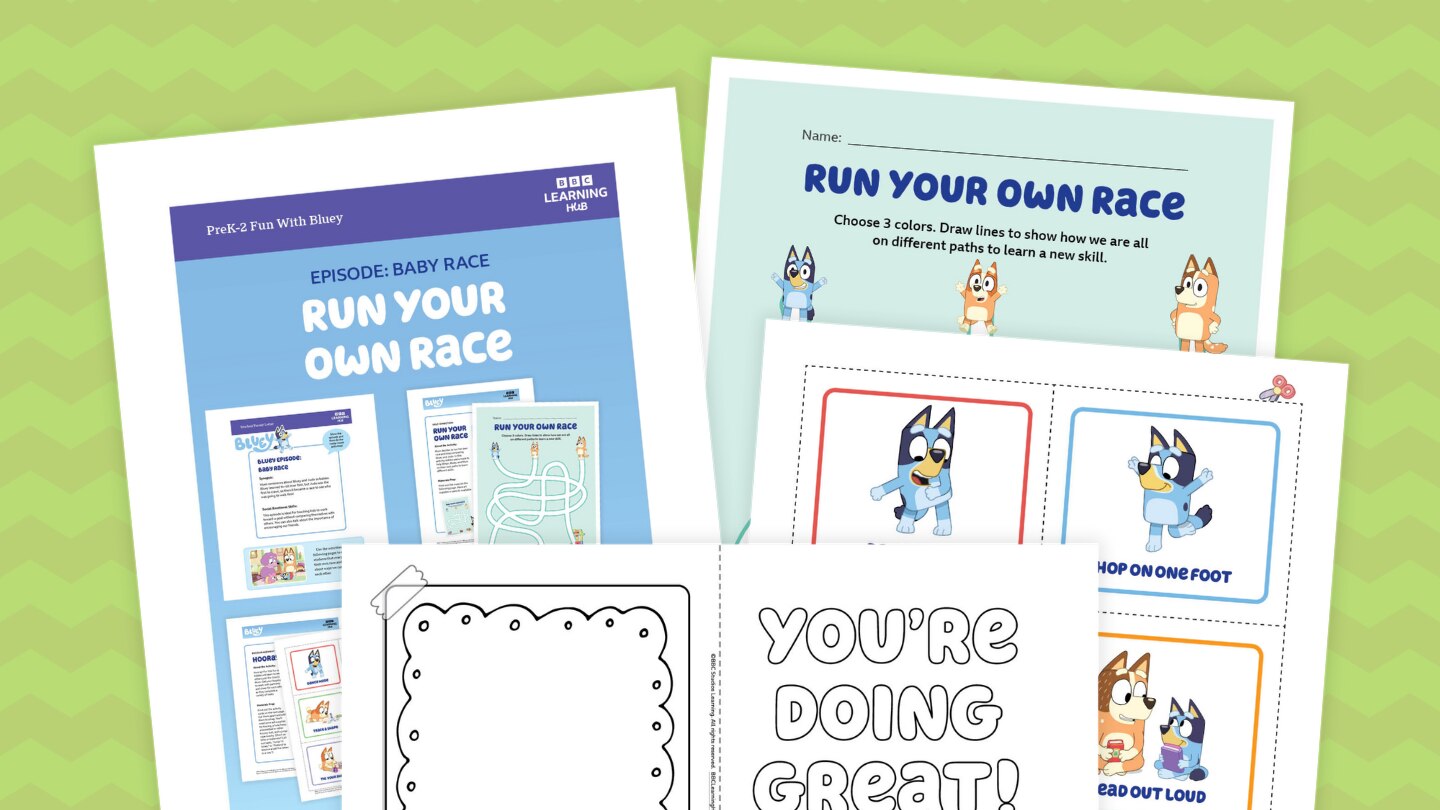 It's important not to compare ourselves with others, and we also need to learn how to cheer on our friends. Based on the Bluey episode "Baby Race," this lesson beings with a classroom conversation about what it means to run your own race. The lesson includes printables for three activities in which kids complete a maze to help Bingo, Bluey, and Mum on their own paths to learn different skills, cheer for each other as they complete different tasks, and make cards for someone who's been working hard.