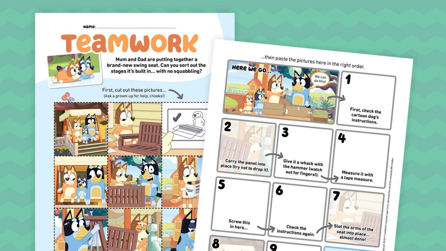 Teamwork makes the swing work! Mum and Dad are putting together a brand-new swing seat. Can you sort out the stages it’s built in... with no squabbling? First, cut out the pictures and then paste them in the right order (use the words in the boxes to help you!).