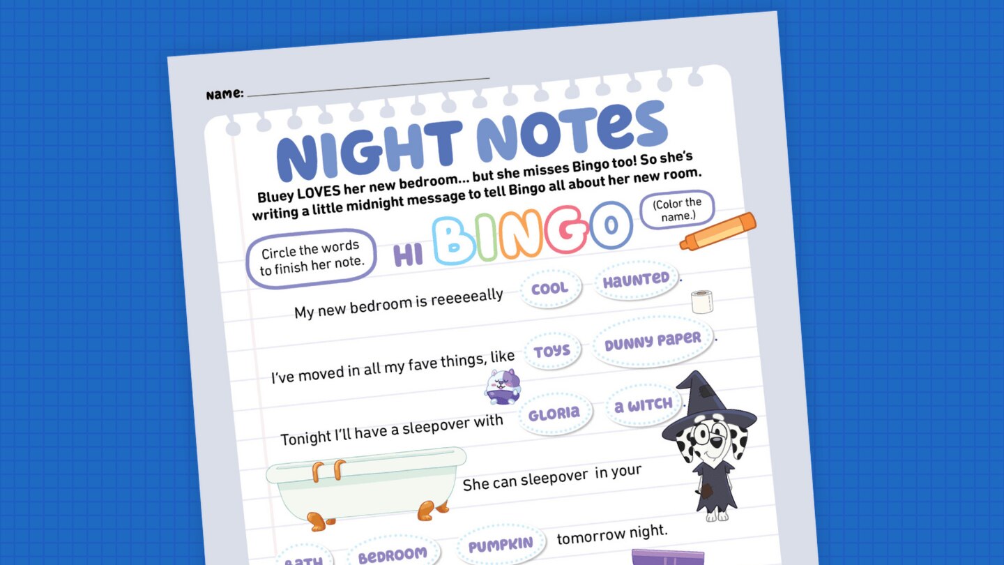 Bluey LOVES her new bedroom... but she misses Bingo too! So she’s writing a little midnight message to tell Bingo all about her new room. Circle the words to finish her note. For example, "My new bedroom is reeeeeally COOL or HAUNTED" and "I've moved in all my fave things, like TOYS or DUNNY PAPER." You decide!