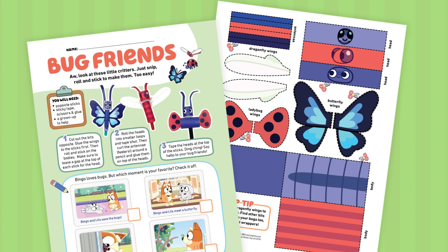 Join Bluey and Bingo in the great outdoors. Match close-ups to the right bug (walking leaf, dragonfly, and ladybug), put leeches in size order from smallest and biggest, and fill out a fun spotting chart on your next nature walk. Can you find a plant, creature, bird, and stick or pinecone? Draw them!