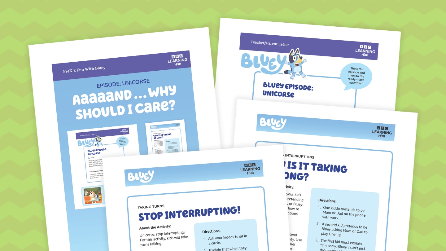 Unicorse, stop interrupting! Watch the Bluey episode "Unicorse" before you teach this lesson about taking turns. The lesson includes printables for three activities in which kids take turns talking, make their own Unicorse puppet, and practice dealing with interruptions (Mum is on the phone and Bluey wants to play Driving!).