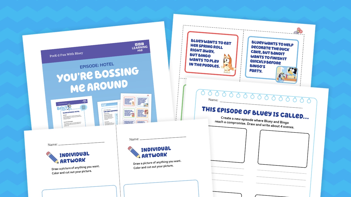 But Bingo wants to be a crazy pillow! This fun lesson uses the Bluey episode "Hotel" as the kickoff to a classroom conversation about compromise. The lesson includes printables for three activities in which kids work in small teams to consider scenario cards and help Bluey and her family reach a compromise, write a new episode of Bluey where Bluey and Bingo come to an agreement, and work together to create a piece of collaborative artwork.