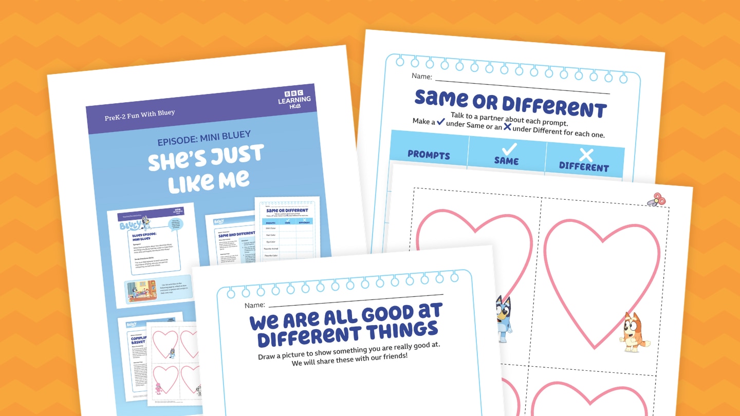 If everyone was the same, life would be boring! Try this lesson, which uses the Bluey episode "Mini Bluey" as the kickoff to a classroom conversation about the importance of being yourself. The lesson includes printables for three activities in which kids complete a same or different worksheet with a partner, write compliments to each other, and draw what they're good at.