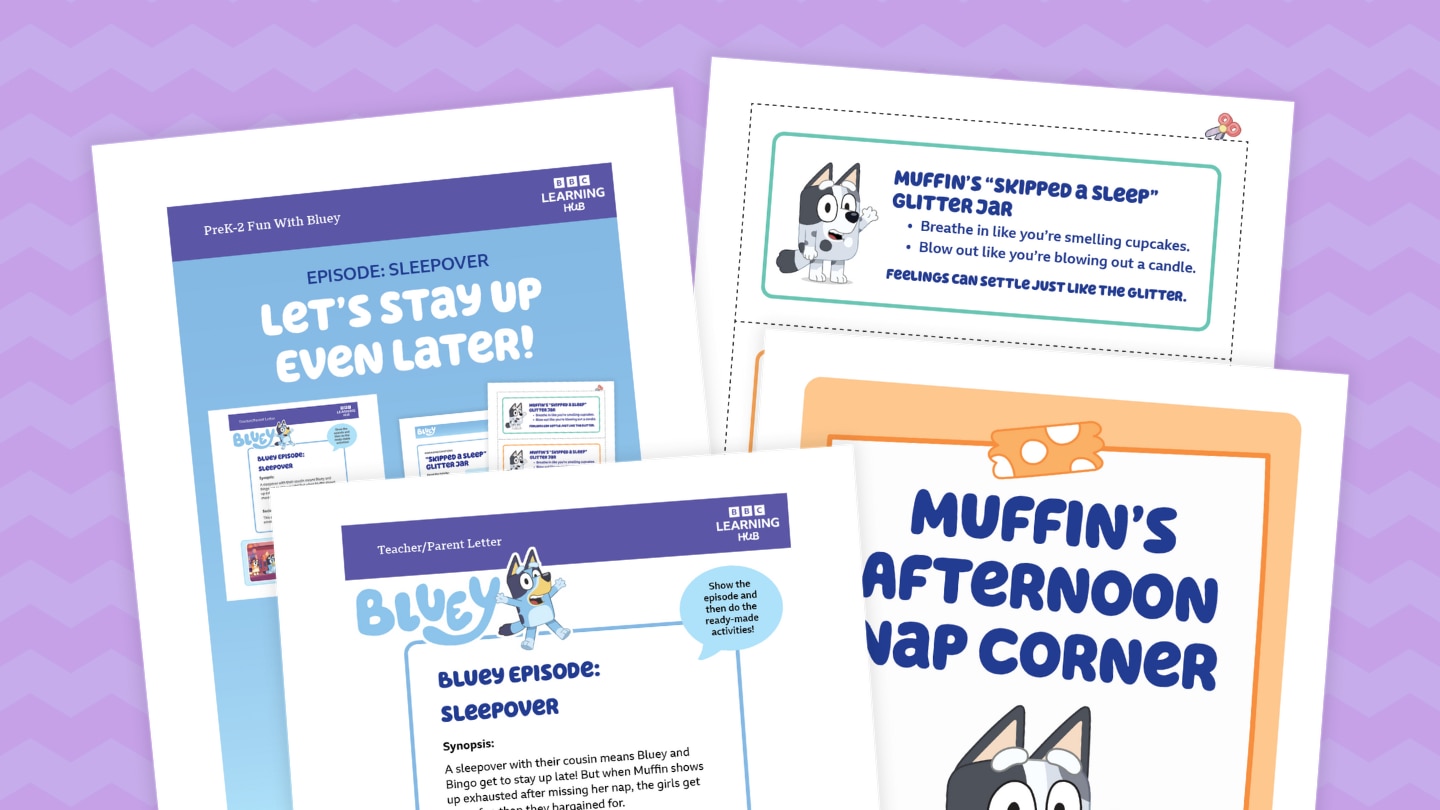 Sometimes we all need to calm down. Based on the Bluey episode "Sleepover," this lesson begins with classroom conversation about managing emotions. The lesson includes printables for two activities in which kids make a calming "Skipped a Sleep" glitter jar and take a rest in Muffin's Afternoon Nap Corner,