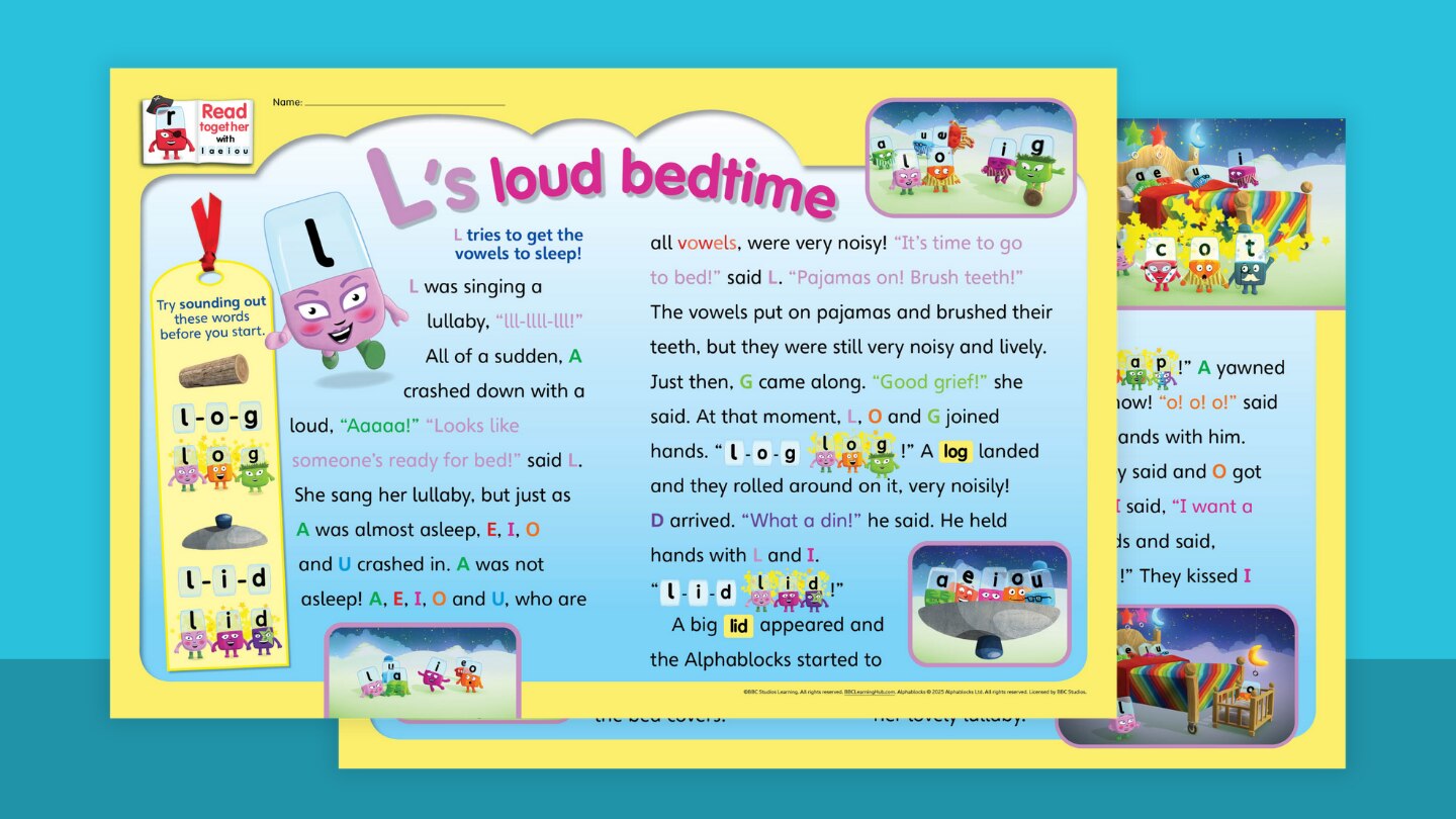 Practice blending sounds with a silly bedtime story. Read along, build the words, and see if you can help L get the vowels to sleep!