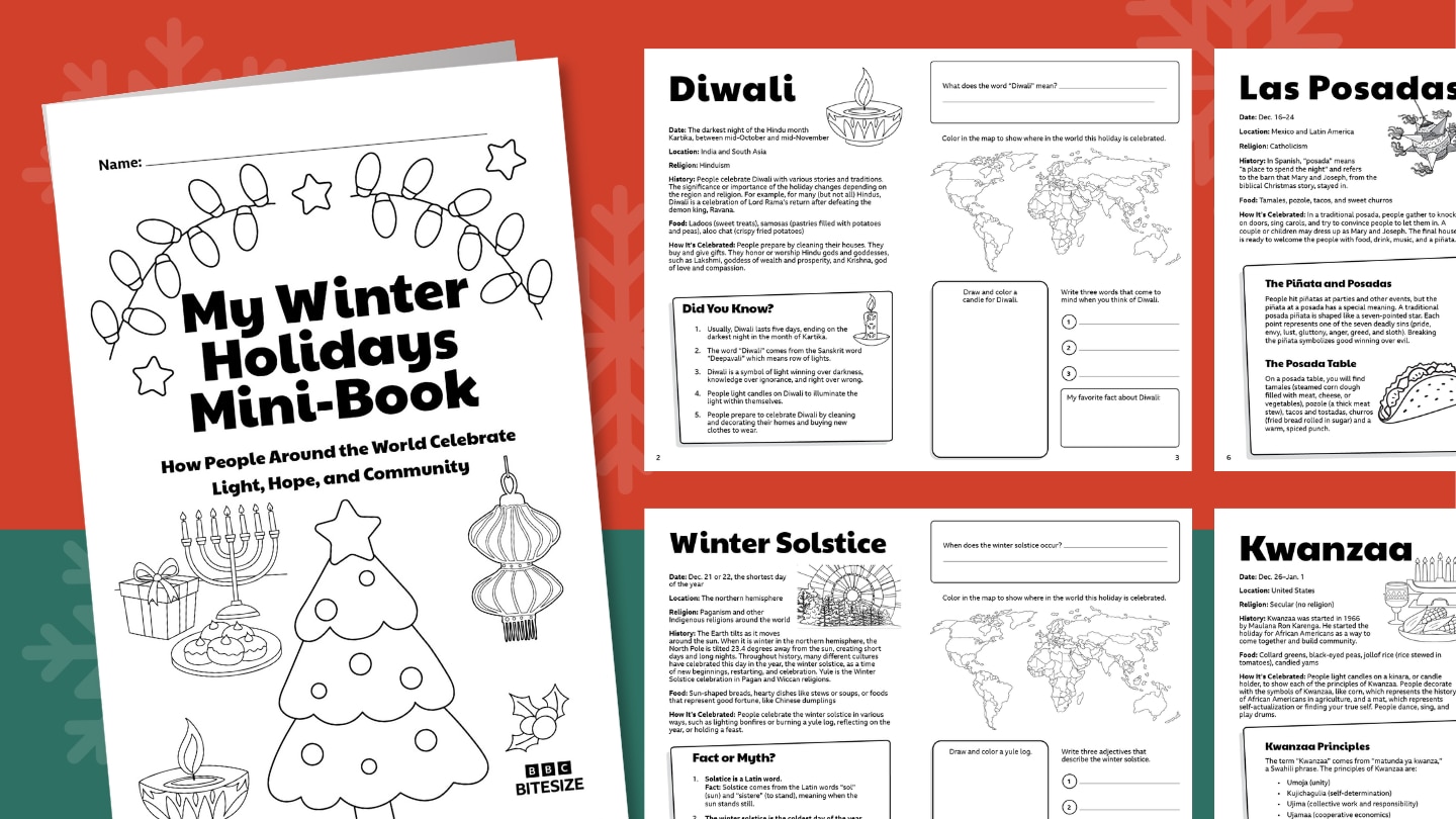 Happy holidays! With so many celebrations all over the globe during this season, it's the perfect time to teach your Grade 3–5 students about winter holidays around the world. Make copies of this mini-book (simply print on both sides flipped on the short edge, stack, and fold to assemble) for your students and invite them to read about each holiday and complete a simple report page full of questions, coloring, drawing, favorite facts, and more. Here are the eight winter holidays covered: