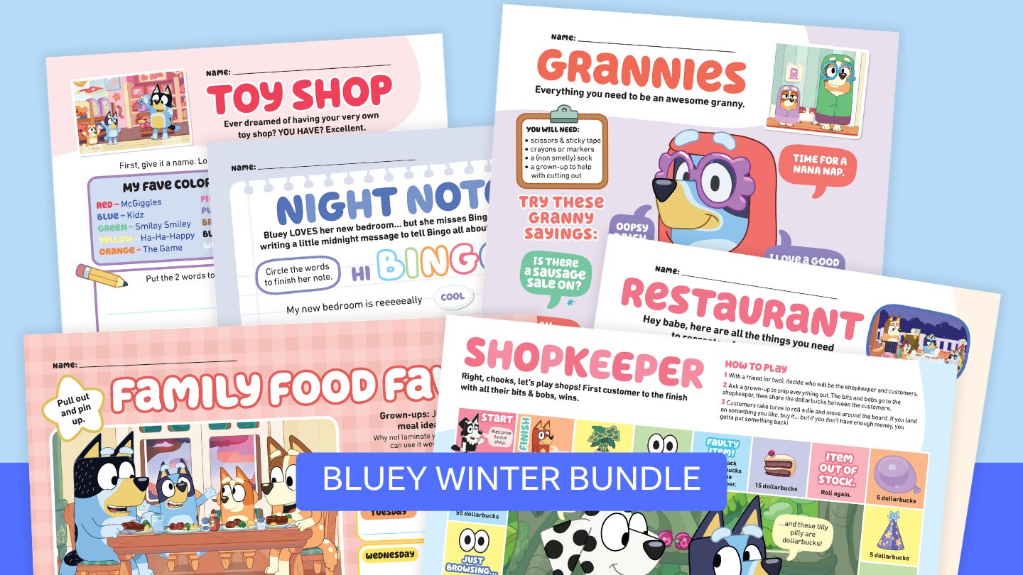 For the winter season, we've pulled together some of our favorite Bluey printables just for you and yours! And we've got you covered all the way through the winter holidays. We picked out some great shopping- and dining-themed activities to kick off the season plus Santa letters for later on. Here's some of what's included: