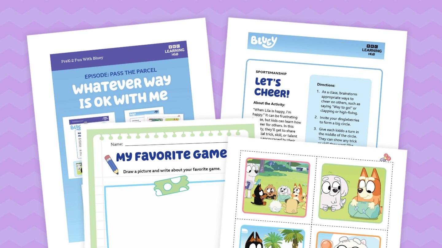 Whether you play Lucky's dad's way or not, you have to be a good sport! Watch the Bluey episode "Pass the Parcel" before you teach this lesson about how to handle it when things don’t go as expected. The lesson includes printables for three activities in which kids look for examples of good sportsmanship in the episode, draw themselves playing their favorite game or sport, and take turns sharing a special skill or talent while being encouraged by friends.